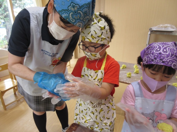 エプロンと三角巾をつけて、スイートポテト作りにチャレンジしました。