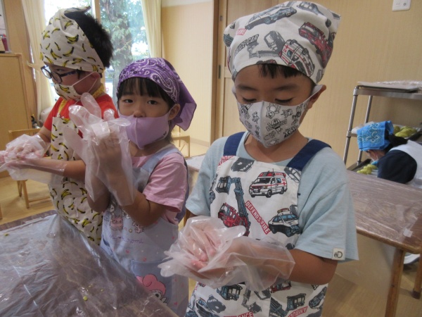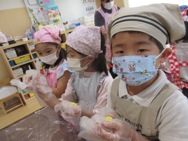 お芋を丸めて、形を作る子どもたち。一人三個ずつ頑張って作りました。