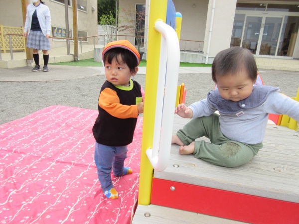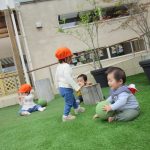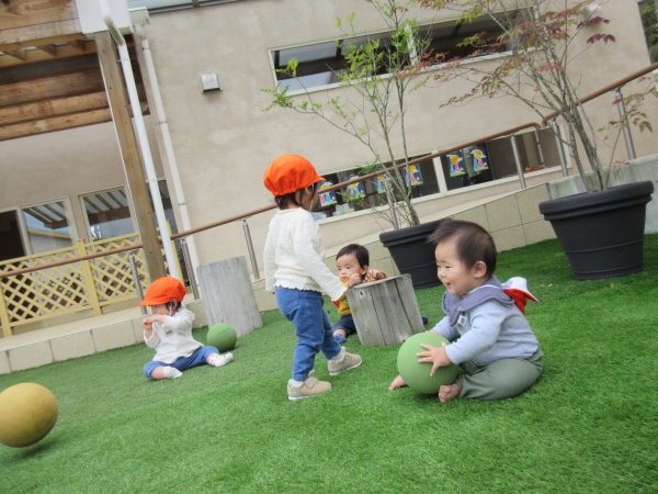 つくし組(0歳児)のお友だちは、芝の上やマットの上で、お庭遊びを楽しんだり、もも組(1歳児)のお友だちは、お靴を履いて、広いお庭をかけっこをしたり、ボールを追いかけたり、体をたくさん動かして遊びました。