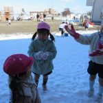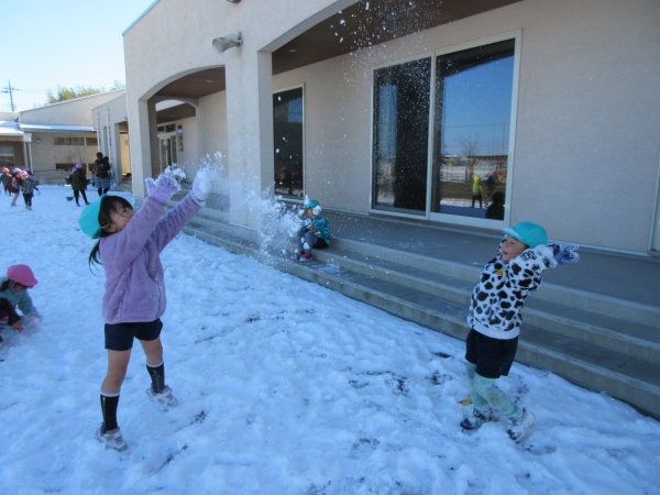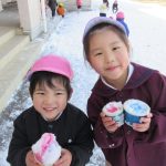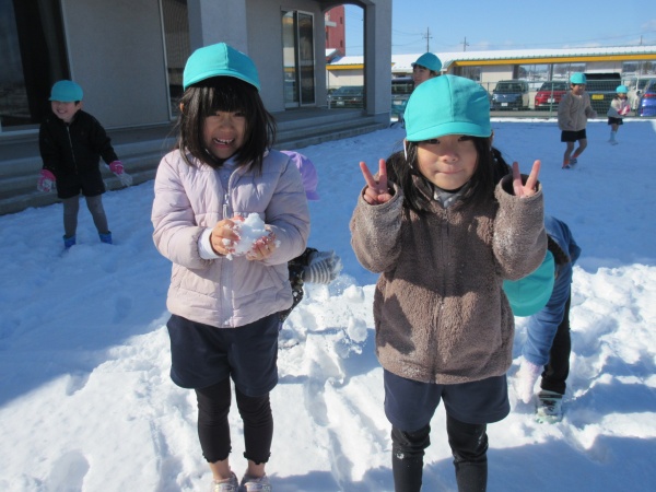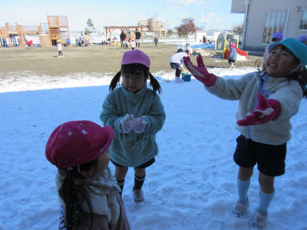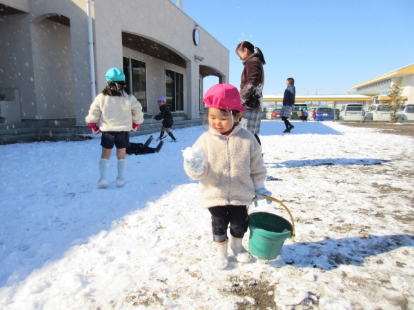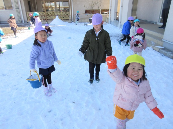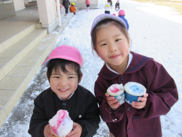 雪遊び 朝からみんなで雪遊びを楽しみました。 久しぶりの大雪に子ども達も大喜び。 サラサラの雪をスコップですくい、色水をつけてごっこ遊びを楽しんだり、 カップに雪を詰めて型を作って遊んだり、雪遊びを満喫しました。