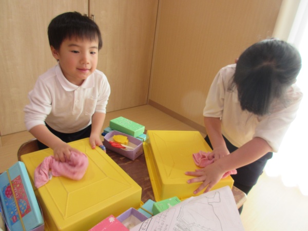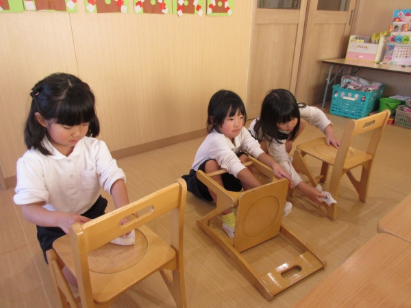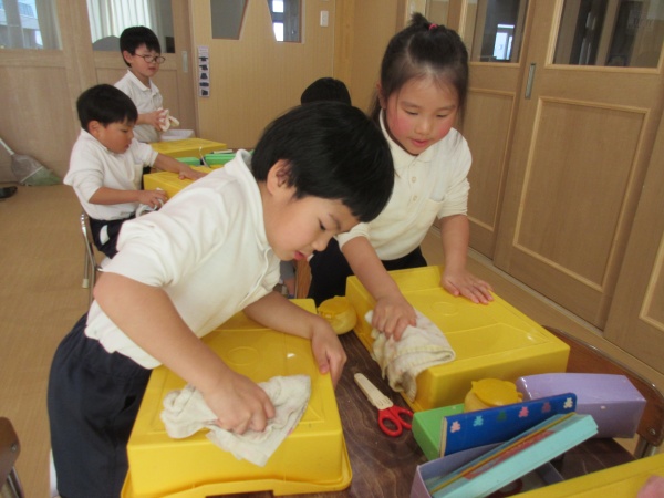 大掃除 クリスマスも終わり、いよいよ明日からは冬休み。 今日は、子どもたちと一緒に大掃除を行いました。 自分のロッカーなどを綺麗に拭き掃除をしたり、お片付けをしてお掃除を頑張った子どもたち。 お友だちと「また来年。」「よいお年を」と挨拶をしました。 今年も保護者の皆様のご理解ご協力ありがとうございました。新年もよろしくお願いいたします。 職員一同、子どもたちが元気に登園してくる姿を楽しみにしています。